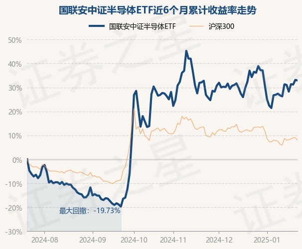 本站消息,1月22日,国联安中证半导体ETF最新单位净值为1.0229元,累计净值为2.0458元,较前一交易日下跌0.19%。历史数据显示该基金近1个月下跌3.01%,近3个月上涨3.34%,近6个月上涨32.9%,近1年上涨50.89%。该基金近6个月的累计收益率走势如下图: