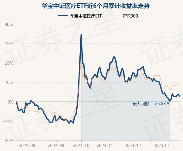 本站消息,1月22日,华宝中证医疗ETF最新单位净值为0.3093元,累计净值为0.9279元,较前一交易日下跌1.12%。历史数据显示该基金近1个月下跌8.52%,近3个月下跌10.06%,近6个月上涨2.21%,近1年下跌11.48%。该基金近6个月的累计收益率走势如下图: